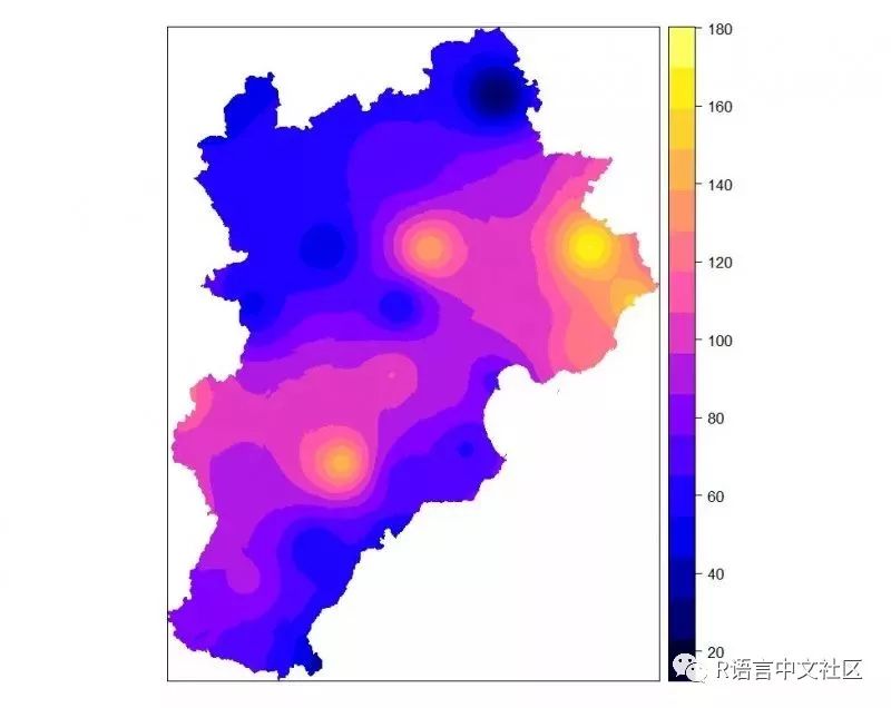kri<-krige(formula=rain~1,model=v.fit,locations=dsp,newdata=Grid,nmax=12, nmin=10)#location为已知点的坐标;newdata为需要插值的点的位置;nmax和nmin分别代表最多和最少搜索点的个数