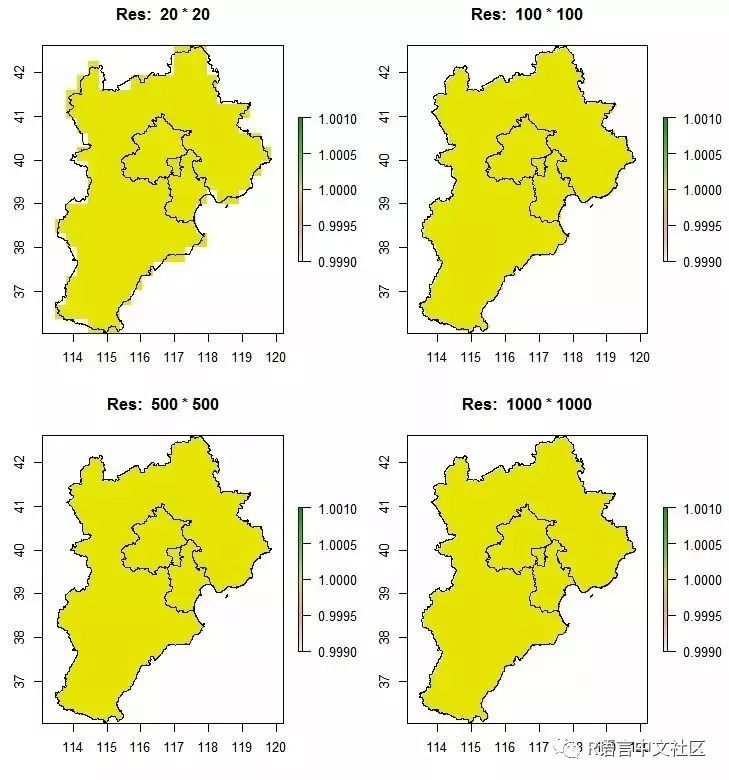 下图则看起来要好的多了,下面将用到rasterize进行正式转换了,这里需要注意的是栅格是有分辨率的,因此上面设置的100*100的分辨率有可能不一定合适,我们用循环看一下