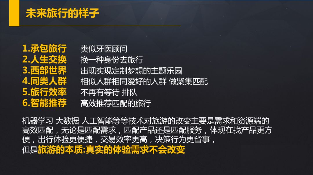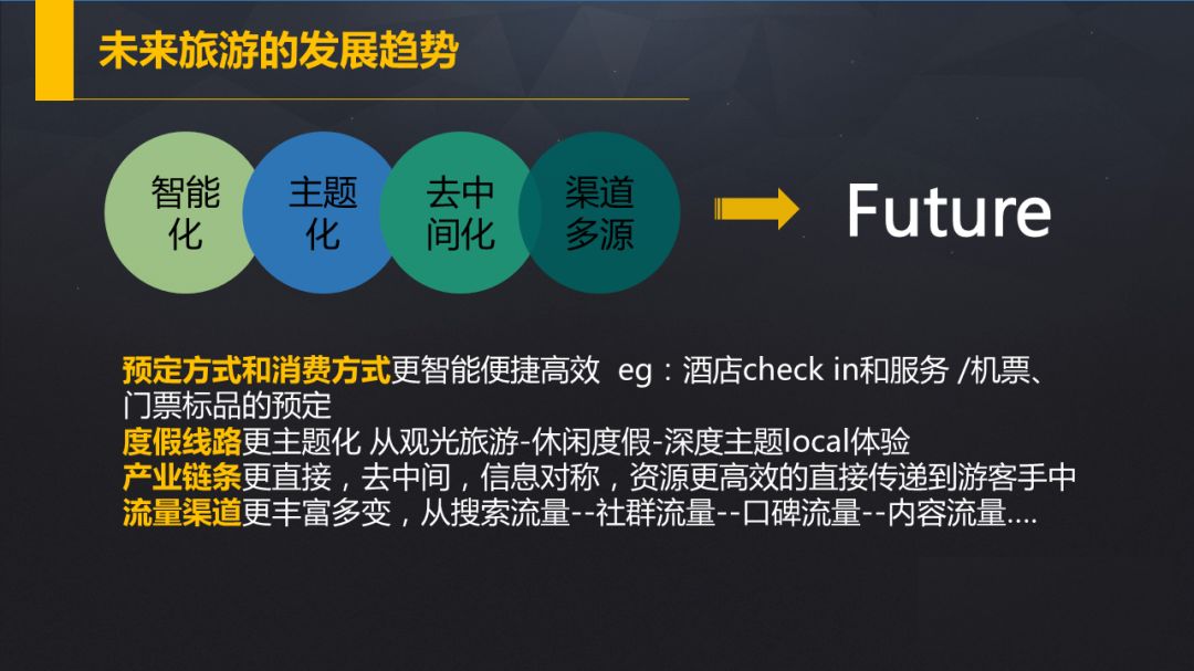第三个就是前面我们说到的:旅游的产业链条不断地去中间化,资源更高效的直接传递到游客手中。