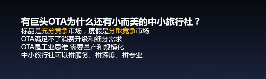 我个人觉得在非标品的度假市场,还有一些机会。因为标品的流量型业务是充分竞争市场,这部分生意主要是靠流量,是属于巨头的,OTA有流程优势和规模流量,是有一些工业化流水线操作优势的。