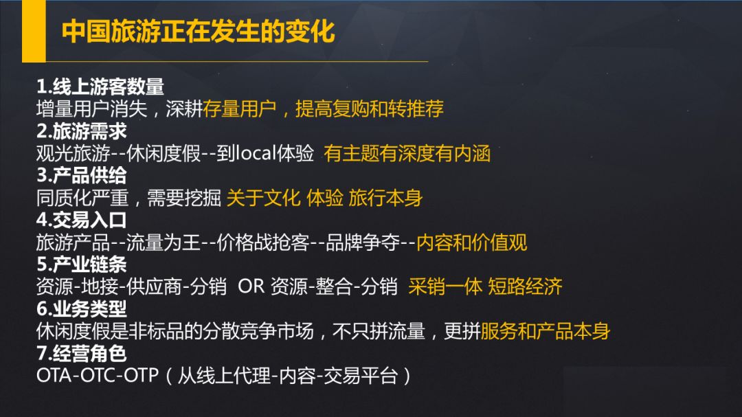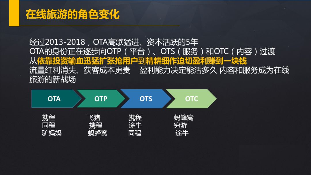 在线旅游已经从单纯OTA(代理)到OTP(平台)到OTC(内容)到OTS(服务)多种模式并存和角色的迁移,只做卖货渠道的公司,已经没有持续生存的空间。