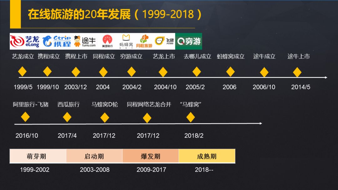 从1999年携程艺龙成立的萌芽期,到2003年-2008年间的启动期;今天大家所看到的成规模的OTA,途牛同程去哪儿,穷游蚂蜂窝,都是在这一段时间成立。