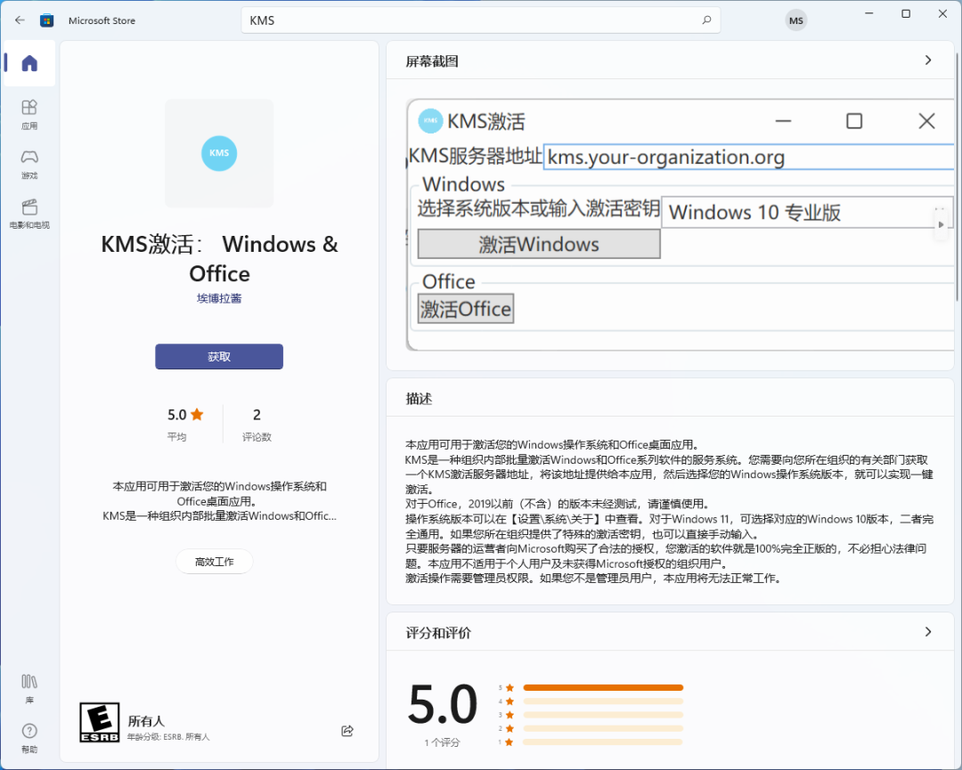 近日,以破解 Windows 系统和 Office 闻名的“KMS 激活工具”,竟然成功在微软应用商店上架了,而且目前该软件的口碑还不错,获得了满分 5 分的评价。
