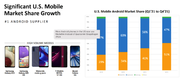 IDC 指出,联发科市场占有率大幅提升,主要是三星 Galaxy A12、Galaxy A32、摩托罗拉(Motorola)G Pure 购买热潮旺盛。去年第四季搭载联发科芯片的智慧手机中,上述几款的销售比重达 51%,并占美国整体 Android 市场购买热潮的 24%。