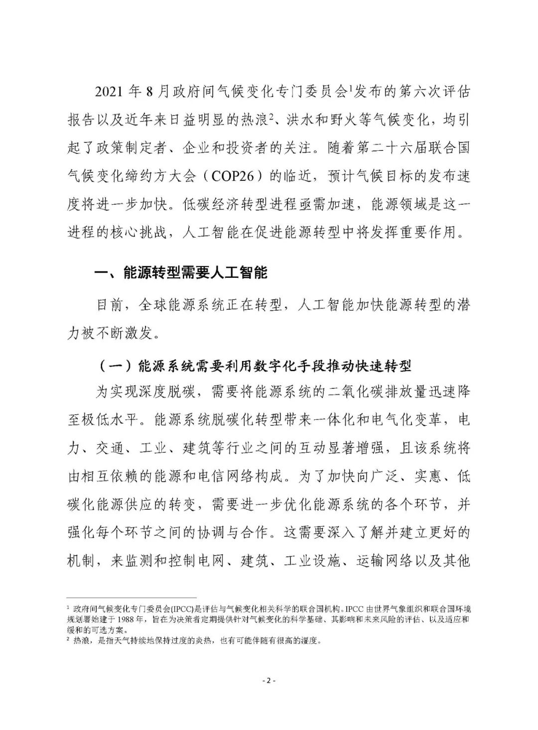 2021年8月政府间气候变化专门委员会发布的第六次评估报告以及近年来日益明显的热浪、洪水和野火等气候变化,均引起了政策制定者、企业和投资者的关注。随着第二十六届联合国气候变化缔约方大会(COP26)的临近,预计气候目标的发布速度将进一步加快。低碳经济转型进程亟需加速,能源领域是这一进程的核心挑战,人工智能在促进能源转型中将发挥重要作用。