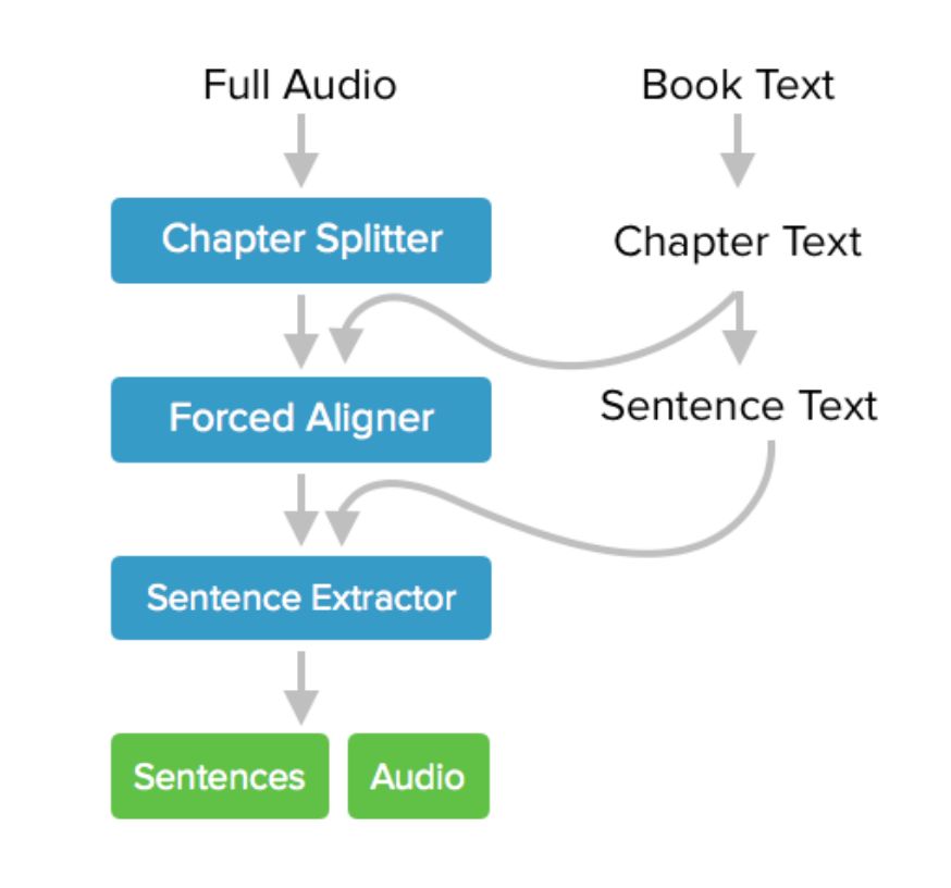 首先要处理的就是收集音频语料以及所对应的文本标签,这里作者下载的是哈利波特的听书音频,以及对应的文本材料。接下来要做的就是对这个音频进行分割以及赋予每个小音频正确的文本标签。对于文本其实比较好处理,因为章节之间的格式很明显,很容易可以使用正则表达式来得到想要的分割。