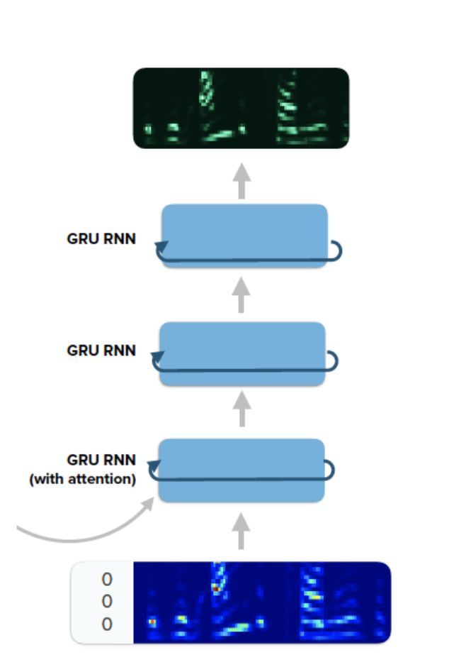 另一个模块就是注意力和RNN解码器,注意到对于每一帧频谱的输入,解码器输出的是r帧频谱,这种做法可以加速执行时间,不过给训练和生成的实现方法上带来了差异。在训练过程中,当预测了r帧梅尔频谱以后,第r个时间点的频谱标签将作为模型的输入,模型基于这个预测下一批r帧梅尔频谱;在生成阶段,除了一开始模型使用0填充的帧作为输入以外,后面的时刻将会使用前一时刻输出的r帧中的最后一帧梅尔频谱作为输入。如下图所示,解码器和注意力层中所用的均为GRU,注意力层是一个带有Bahdanau注意力机制的GRU,解码RNN由两个带有residual connection的GRU层构成,解码器自始至终都是每步产生r帧输出,最终解码器的输出作为CBHG网络的输入。这种解码器只需要执行T/r步,假设T为输入的总帧数。