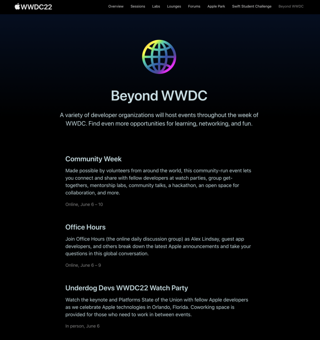 Apple 也很贴心地为我们整理了一些值得关注的、由全球不同开发者组织发起的 WWDC 讨论活动,其中有像雅虎这种大公司举办的相关活动内容,也有来自独立开发者或者民间组织发起的讨论活动。