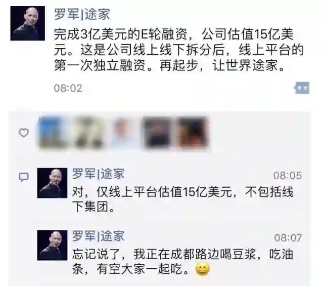 2015年8月3日,途家网确认获得3亿美元D轮融资,2016年10月31日,在宣布并购携程去哪儿公寓民宿业务后,罗军发布内部信,宣布做出重大组织架构调整,成立平台运营公司、线下运营公司和途家控股管理机构。这一次的融资是途家线上线下业务拆分后的首轮独立融资。