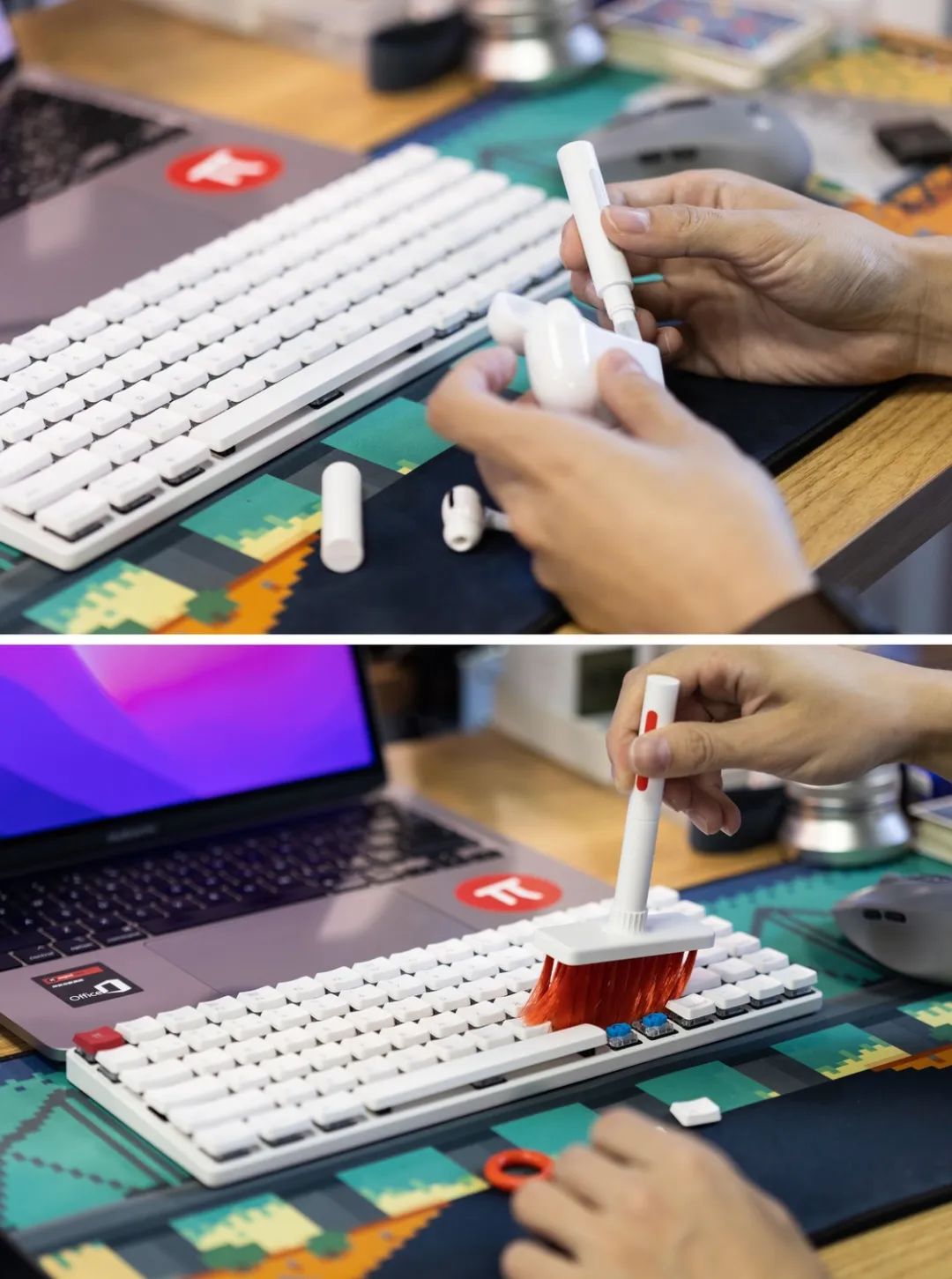 ,分享清洁的方式。而来自海备思的清洁刷 / 清洁笔或许会让你的清洁工作方便些。清洁笔拥有多功能清洁头,植绒海绵可以清洁耳机盒充电仓,金属笔尖深入清洁缝隙,细毛刷则可以清扫表面灰尘。