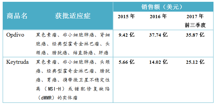 根据两家公司的最新财报显示,Opdivo 2017年第三季度(Q3)拿下了12.65亿美元的销售业绩,较去年同期的9.20亿美元上涨38%,今年前三季度累计销售额达35.87亿美元;Keytruda Q3拿下10.47亿美元,较去年同期的3.56亿美元上涨194%;今年前三季度累计销售额达25.12亿美元。