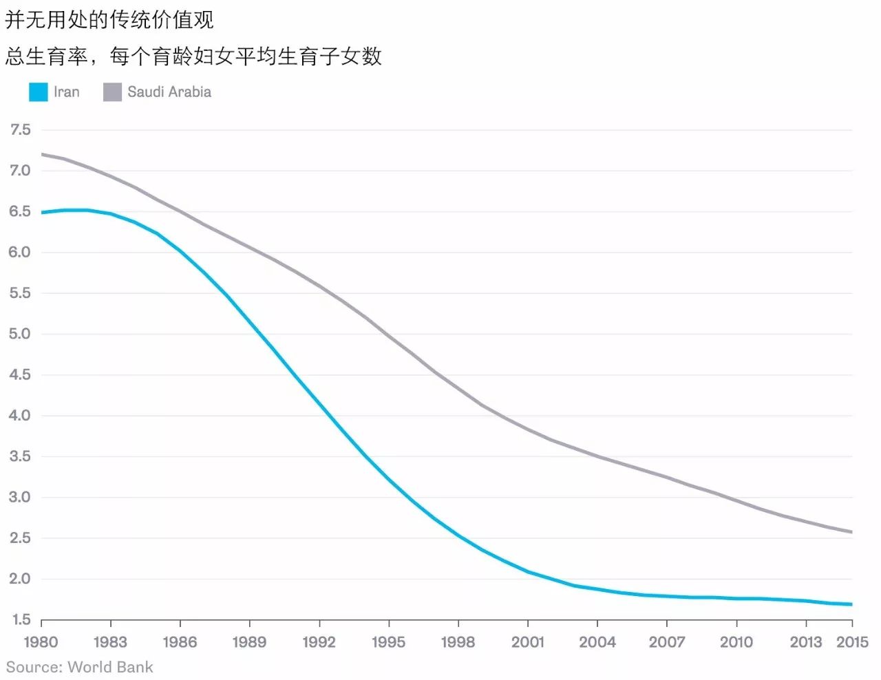 有例为证,1979年建立了神权政府的伊朗开始大力推行传统价值观,但该国生育率目前处于人口置换率之下。同样严格践行宗教律法的沙特阿拉伯,其生育率也在大幅下滑:
