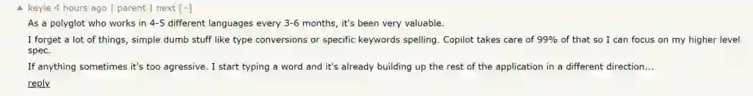 这位开发者表示:“我容易忘记很多事情,甚至是一些很简单的蠢事,如类型转换或特定的关键词拼写。而Copilot 可以解决 99% 的问题,这样我就可以专注于我的高级规格。”