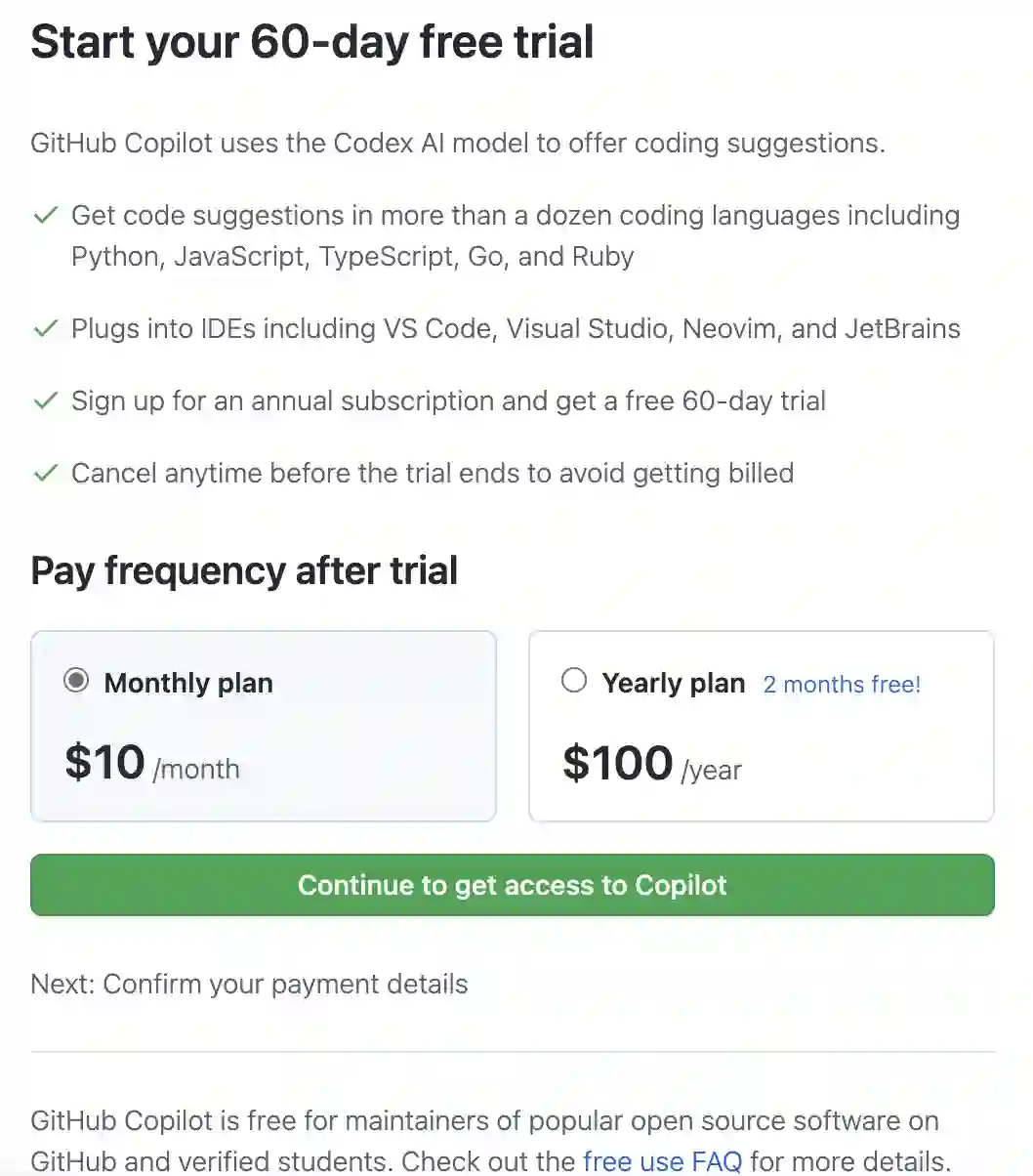 不过值得注意的是,收费群体也是有限制的,其中通过身份验证的学生和热门开源项目维护者可以免费使用。