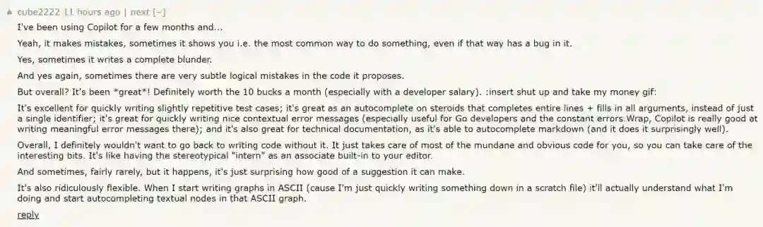 另一位已经使用 Copilot 几个月了开发者也表示,尽管 Copilot 会犯很多错误,但总的来说它一直都很好!绝对值得每个月花 10 美元(特别是相对开发人员的工资来说)。