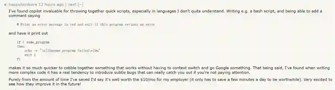 一位开发者表示:“Copilot 对于快速编写脚本是非常有价值的,尤其是面对不太懂的语言时,能更快地拼凑出一些能用的东西。但是在写更复杂的代码时,如果不注意的话,它容易产生一些小的 Bug,让人非常抓狂。单纯从节省的时间来看,我认为对于我的雇主来说,10 美元/月是非常值得的(每天只需要节省几分钟就值得了)。我很高兴看到 Copilot 在未来的改进。”