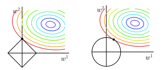 上图代表的意思就是目标函数-平方误差项的等值线和L1、L2范数等值线(左边是L1),我们正则化后的代价函数需要求解的目标就是在经验风险和模型复杂度之间的平衡取舍,在图中形象地表示就是黑色线与彩色线的交叉点。