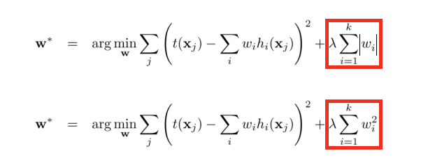 针对线性回归模型,假设对其代价函数里加入正则化项,其中L1和L2正则化项的表示分别如下所示,其中λ >= 0,是用来平衡正则化项和经验风险的系数。
