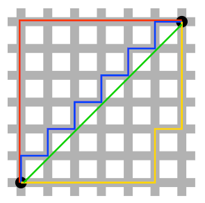 我们引用文章里的图片,L2-norm的距离就是两个黑点之间的绿线,而另外的3条线,都是L1-norm的大小。