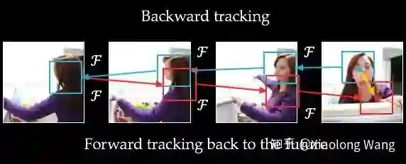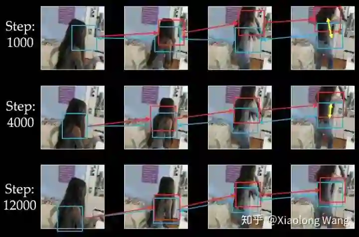 我们在VLOG 数据集(github.com/xiaolonw/Tim) 上面进行unsupervised learning。在训练之后的网络我们可以直接应用在以下不同的tracking tasks,不需要在目标数据集上做任何的training/fine-tuning。