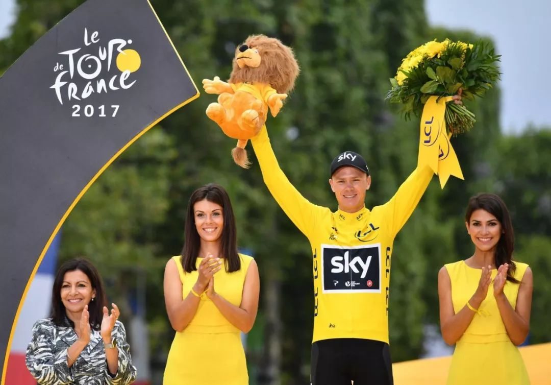 2017年环法自行车赛冠军,天空车队自行车手克里斯托弗·弗鲁姆(Christopher Froome)在领奖台上庆祝