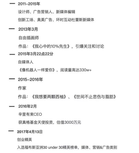 ▲很难相信这是一位92年女生的TIME LINE,她几乎每年都在迎来一个新的身份,新的自己。