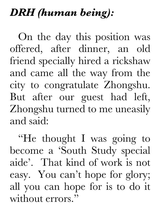 事定之日,晚饭后,有一位旧友特雇黄包车从城里赶来祝贺。客去后,钟书惶恐地对我说,“他以为我叫做南书房行走了。这件事不是好做的,不求有功,但求无过。”