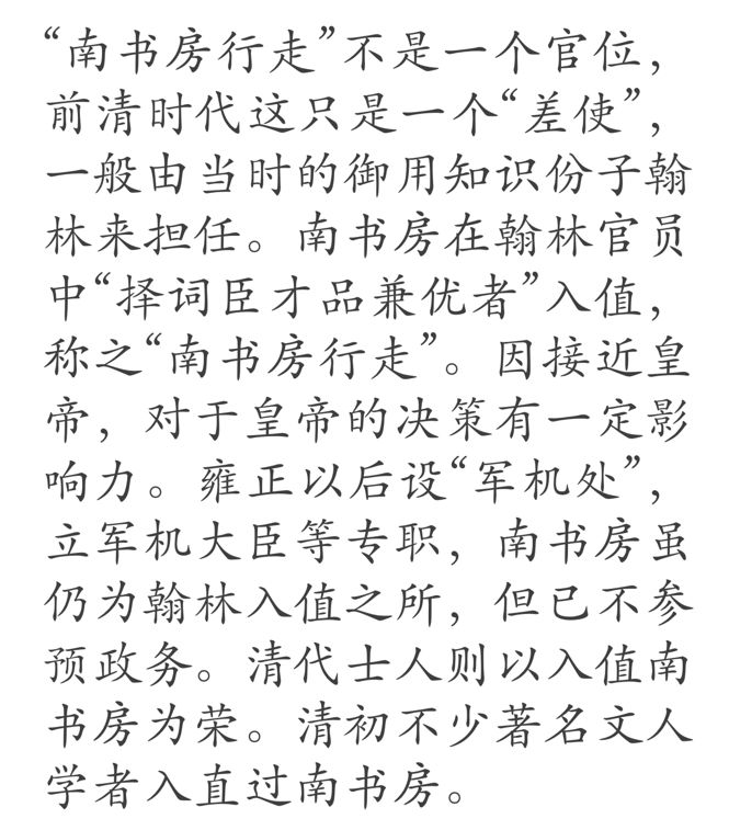 这个南书房行走,侯世达教授翻译成 South Study special aide,实际上他想了很长时间才想清楚怎么翻译,还问了一下他的夫人。侯世达教授的夫人是中国背景,教授跟他的夫人说把 “行走” 翻译成 “信使” 可不可以,夫人说看不懂,于是他就使用谷歌搜索引擎来进行了一下搜索,又搜索南书房行走这 5 个字,最后出现了一个由人写作的网页,这才解决了侯世达先生的一个疑问。