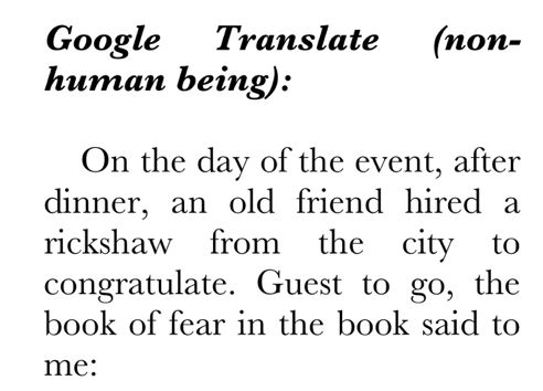 机器翻译不懂什么是山,什么是声音,什么是绿色,什么是青苔,机器翻译不知道空间,不懂时间,不懂上或下,不懂大或小,不懂人,不懂物,也不懂世界,不懂任何存在,也不懂任何发生的事,基本什么都不懂。机器并不是说稍微地在懂一些什么东西,它根本就不了解它所工作的文本,它一点都不懂。机器翻译是空洞的,句号。机器翻译仅仅是机器翻译而已,句号。”