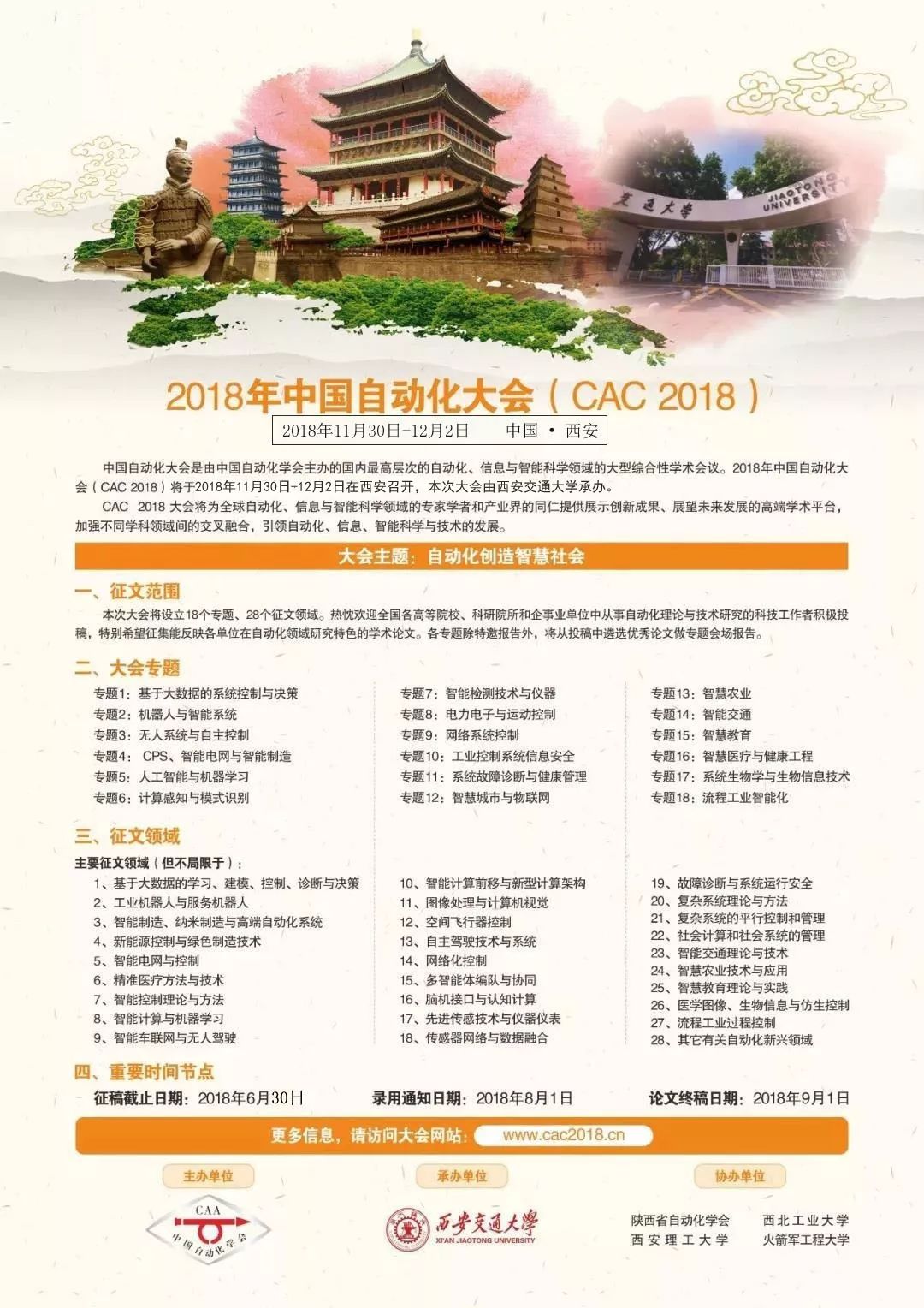 中国自动化大会是由中国自动化学会主办的国内最高层次的自动化、信息与智能科学领域的大型综合性学术会议,2018年中国自动化大会(CAC2018)的主题为“自动化创造智慧社会”,大会将于2018年11月30-12月2日在西安召开。本次大会由西安交通大学承办。
