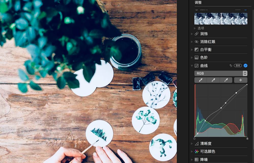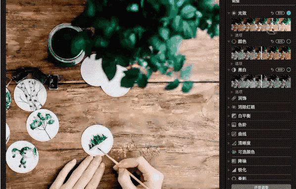 调整工具菜单:包括光效、颜色、黑白、润饰、消除红眼、白平衡、色阶、曲线、清晰度、可选颜色、降噪、锐化和晕影。每项对应下拉小窗,操作比较细节,让你不再需要 Lightroom 等专业后期工具也能进行一些基础的修图工作。