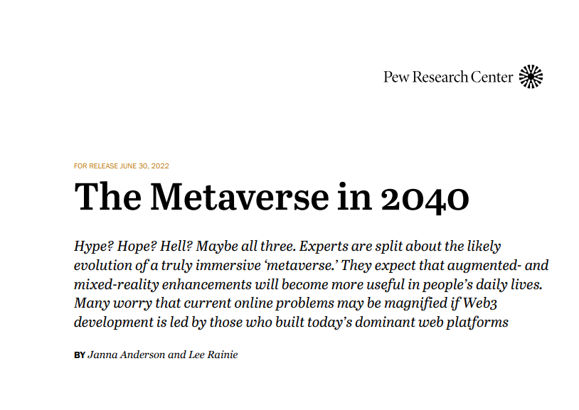 便捷下载,请关注专知人工智能公众号(点击上方蓝色专知关注) 后台回复“meta2040” 就可以获取《204页报告《元宇宙2040》美国智库-皮尤研究中心》专知下载链接