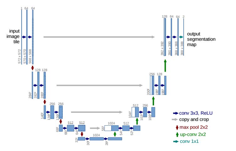 U-Net有很多优点,最大卖点就是它可以在小数据集上也能train出一个好的模型,这个优点对于我们这个任务来说真的非常适合。而且,U-Net在训练速度上也是非常快的,这对于需要短时间就得出结果的期末project来说也是非常合适。U-Net在网络架构上还是非常优雅的,整个呈现U形,故起名U-Net。这里不打算详细介绍U-Net结构,有兴趣的深究的可以看看论文。