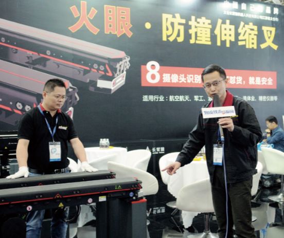 值得一提的是,伸缩货叉作为自动化物流系统的重要配套设备,近年来销量快速增长。在W1馆,太仓长臂猿机器人科技有限公司(简称“太仓长臂猿”)精彩亮相。该公司专注于单深位伸缩叉和双深位伸缩叉的研发、制造,是国内唯一一家能自主设计、自主生产重载双深位伸缩叉产品的企业。在本次CeMAT Asia展会上,长臂猿公司带来了一款新技术产品,将视觉识别与机械相结合的智能安全伸缩叉。这款名为“火眼”的防撞伸缩叉,主打性能是“安全”,可应用在军工、航空航天、流体、精密设备等行业。新品设置有8个摄像头,可以识别整个托盘和货架的位置和孔位,将信息传输给堆垛机的控制箱,再由控制将信息传回给伸缩叉并指定位置,从而使货物的存取更准确快速,并且防止“怼货”的发生。