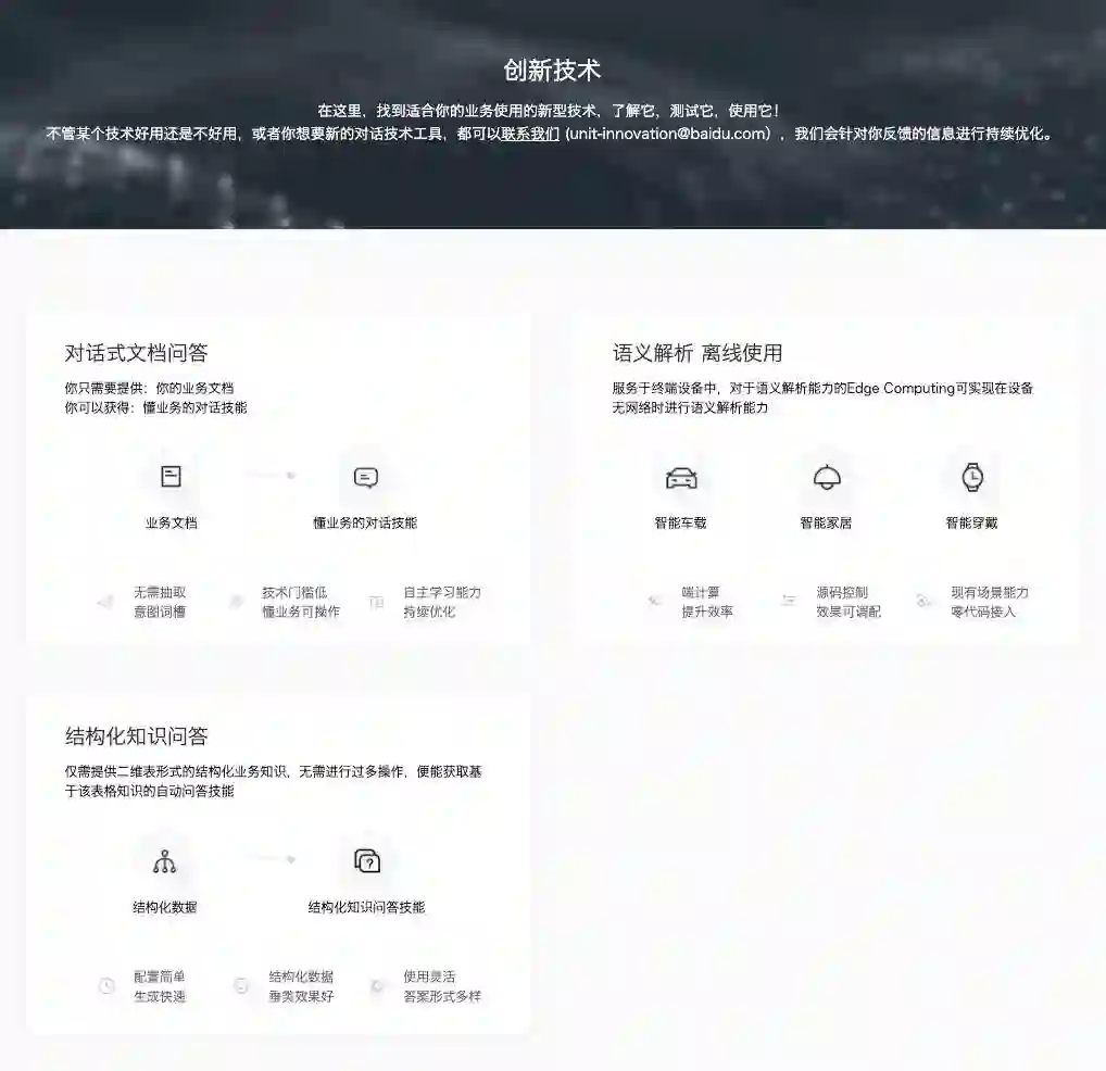 在我们看来,百度和小i敢于在实际产品中上线文档型问答是非常有勇气的,但似乎两家都将这一功能定位为体验为主。UNIT的文档问答入口并不显眼,仅仅是作为创新技术页面的三个功能之一。功能介绍写得也很直白,突出了文档问答对业务友好的特点。建立文档问答技能的操作方式也很傻瓜,准备好一个txt或者word格式的文档直接上传即可,再经过一段时间的训练就可以部署或测试模型了。