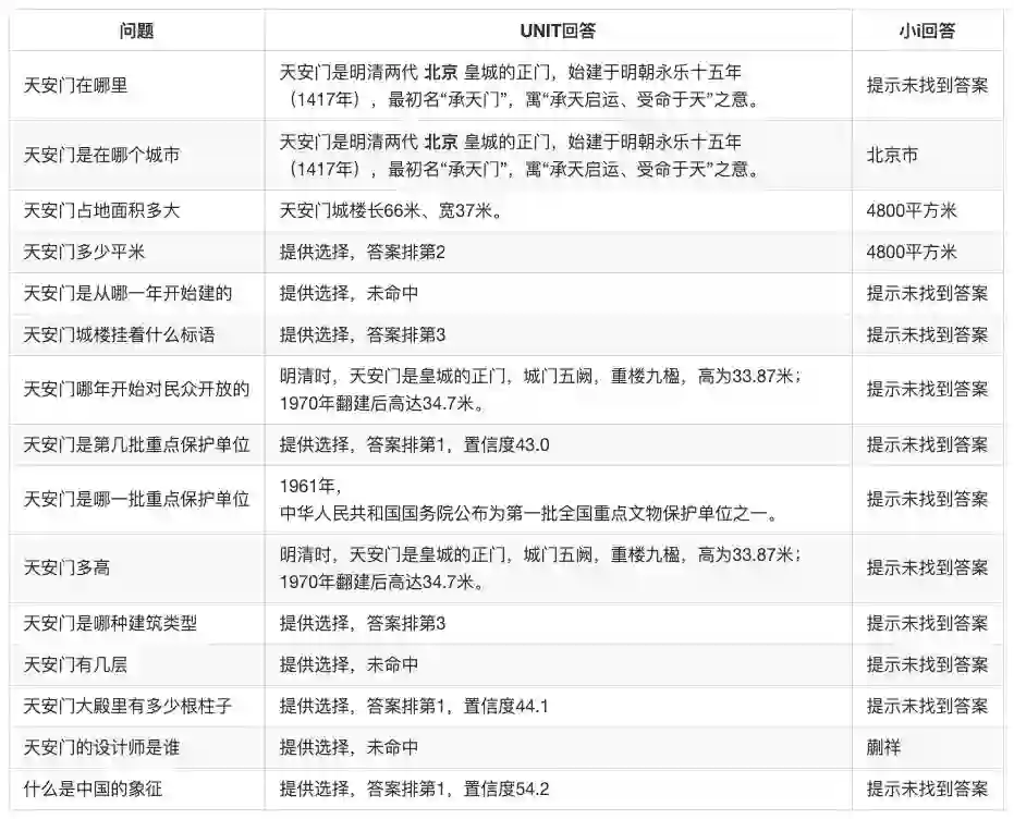 本次我们从百度百科的天安门词条[4]选取了一些文字作为文档。文档不长,一共500余字,包括了较大量的数字信息。针对这段文档,我们仿照SQuAD数据集人工整理了15道可回答问题和5道不可回答问题来对两家的算法进行测试。为了给大家一个直观的印象,在此摘抄第一段: