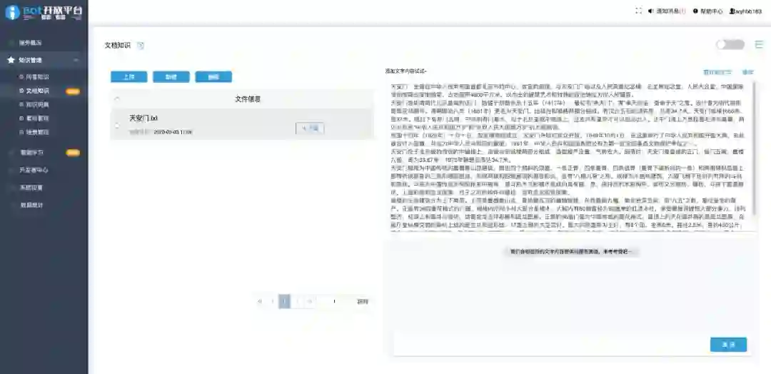 而小i的Bot开放平台将文档知识作为知识管理的一个栏目,并且非常明显地标上了Beta图标。操作方式也同样简单,上传文档即可开始测试。与百度不同的是整个过程甚至无需训练。