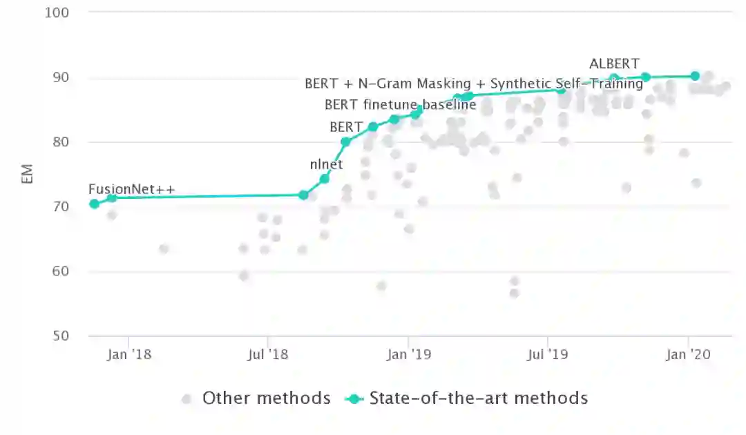 2018年斯坦福在1.0版本数据集的基础上发布了新的SQuAD 2.0。新版数据集不仅包含了原来的所有10万条问题,还人工撰写了五万句根据文章无法回答的问题,而且这些问题都是精心设计,让它们看起来和可回答的问题非常相似。