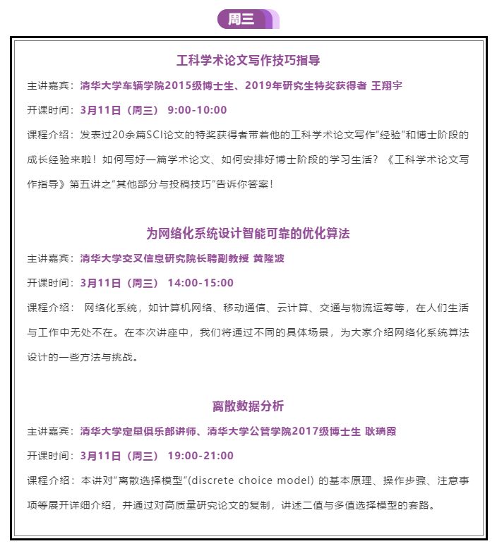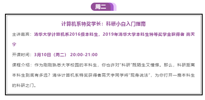 清华大学每周都会发布一周课程预告,清华官方微博、抖音、B站、快手将同时面向全社会进行课程直播。为了帮助大家实现“上清华”的夙愿,清华大学这次也是拼了。无论你是不是清华学子,都能同听一堂课。大家快来看一看这周有哪些你喜欢的课程吧。本周课程一览: