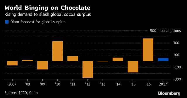 2016年,随着可可产量大增(科特迪瓦的产量创下新记录,排名第二的生产国加纳也大获丰收),伦敦交易的基准可可期货暴跌了23%,创下了2011年以来的最大跌幅。据总部位于阿比让的国际可可组织(International Cocoa Organization)估算,这些非洲国家的丰收将全球生产盈余推高至了37.1万吨。