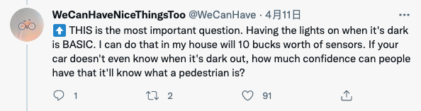 事发后有网友对无人驾驶车的安全持有怀疑态度:「家里的传感器都知道天黑要开灯,对于不知道天黑需要开灯的无人车,那么人们有多大信心相信它的AI司机能判读出行人是什么?」