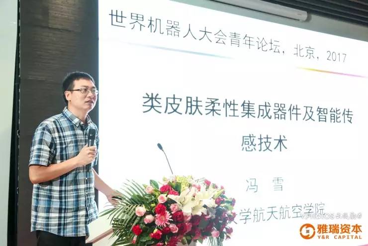 然后,以清华教授冯雪为代表的青年科学家们作了演讲。他主要介绍了“智能人造电子皮肤与可穿戴设备”的研究进展,简要概括一下冯雪教授的研究工作,“就是把现在的集成电路、集成器件能够跟人类的体表集成、跟物体环境进行集成。”