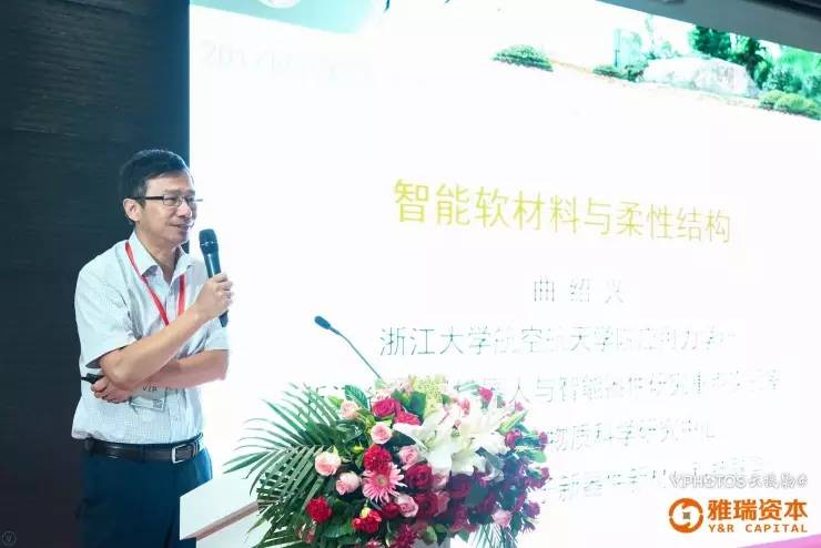 浙大教授曲绍兴介绍了“智能软材料与柔性结构”的研究进展,由于智能软材料的使用对象是软体机器人,所以曲绍兴教授介绍了两者之间的关联。对仿生软体机器人来说,从机械或者是力学上会涉及到仿生驱动机理,还有结构设计理论,制造技术等多学科交叉领域,曲绍兴教授对此作了具体阐述。他也展示了浙大做的三款软体机器人:基于介电高弹体实现智能软材料驱动的全软体机器人、仿生鳐鱼软体机器人、仿生柔性臂。