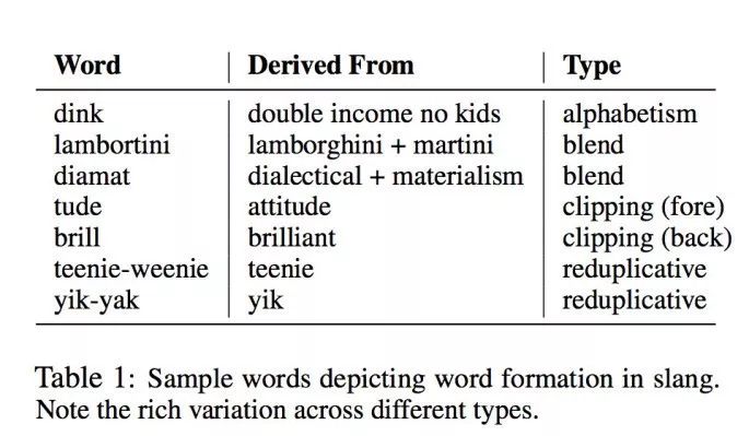 机器能够自动生成俚语吗?加州大学-圣塔芭芭拉的团队在NAACL2018论文中, 提出了几种简单的生成式模型,可以自动生成四大类的英语俚语,包括缩写类、混合类、压缩类、重复类。