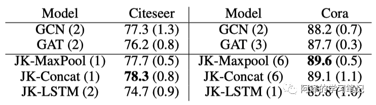 下图为不同模型在不同数据集中的表现,其中 JK-Net 基于 GCN 模型。LSTM 效果不好主要是因为数据集太小了: