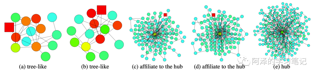 我们可以从(a)中看到,处在中心节点位置的正方形节点经过 4-step 就可以涵盖整个图;而(b)中,处在边缘节点位置的正方形节点,经过 4-step 仅仅扩展了一小部分,经过 5-step 达到核心后才迅速蔓延。