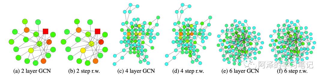 回顾我们看到的第一场图,如果 GCN 使用相同的层数,其与施加固定 step 的随机游走会有相同的效果。相同的层数可能会导致中心区域的节点表示失去局部信息,但却会让边缘节点探索到其周围的局部信息。