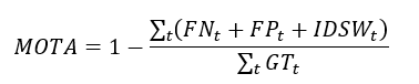 MOTA逐帧地对假阳例(FP)、假阴例(FN)、误匹配(identity switch, IDSW)的个数综合考虑,公式如下。其中t代表图片帧的序号,GT代表真实值的数目。
