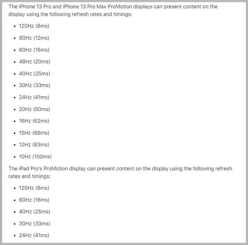 苹果将该技术称为“ProMotion 自适应刷新率技术”。根据苹果的开发者指南,iPhone 13 Pro、Pro Max 支持多达 12 档刷新率:10Hz、12Hz、15Hz、16Hz、20Hz、24Hz、30Hz、40Hz、48Hz、60Hz、80Hz、120Hz。
