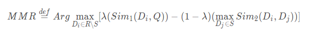MMR,全称为Maximal Marginal Relevance。它的核心思想同时考虑了内容相关性和多样性。公式如下: